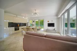 L'appartement comprend : une entrée avec toilette invité, un vaste séjour lumineux avec cuisine américaine entièrement équipée ouvrant sur la terrasse et le jardin, deux chambres avec accès direct à l'extérieur, ainsi que deux salles de douche.