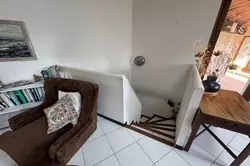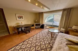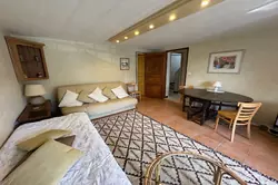 Toujours depuis le séjour, des escaliers mènent à l'étage inférieur où il y a un appartement (accès depuis la maison et également avec un accès séparé si on veut louer p.ex). L'appartement bénéficie d'un séjour avec accès dehors/entrée séparée, d'une chambre, d'une cuisine séparée et d'une salle de bain avec baignoire, douche, lavabo et wc. Le séjour pourrait être transformé en garage à nouveau si souhaitable.
