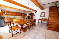 Au deuxième étage, il y a une grande cuisine bien équipée avec coin repas, une chambre spacieuse et une salle de douche.