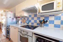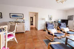 La pièce de vie est généreuse, baignée de lumière, avec une belle cuisine ouverte entièrement équipée. De larges baies vitrées permettent d'accéder à la terrasse (20 m2) ensoleillée et au jardin joliment fleuri, avec une agréable vue sur la mer en toile de fond.