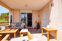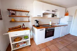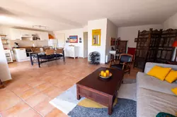 Elle se compose d'un agréable séjour lumineux avec coin repas et cuisine ouverte, s'ouvrant par de grandes baies vitrées sur une terrasse orientée sud avec jolie vue sur la mer. Un espace bureau/alcôve avec canapé-lit et bureau complète le salon.