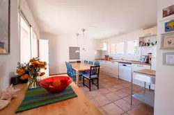 Depuis l'entrée, les escaliers mènent à un séjour lumineux et ensoleillé et à une cuisine américaine équipée avec table à manger.