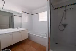 Salle de bain avec baignoire, douche séparée et double vasque.