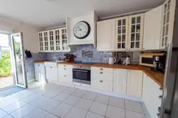 Dans le prolongement du hall, la cuisine dinatoire ouvre, par de larges portes-fenêtres, sur la terrasse orientée sud-est ; un cellier et un second WC viennent compléter cet espace.