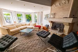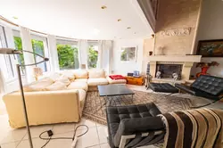 À droite, le séjour-salle à manger de 45 m² s'organise autour d'une cheminée traditionnelle ; une mezzanine y ajoute une touche chaleureuse.