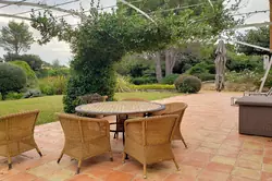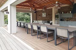 Entre les deux maisons se trouve l'agréable pool house, équipé d'une cuisine d'été ouverte, d'un espace salon avec canapés confortables et d'une terrasse supplémentaire, parfaite pour se détendre ou partager un moment convivial.