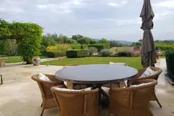 Concernant la vue mer, il y a une belle vue mer de la chambre. De la terrasse et du salon il y a une vue mer qui s'est réduite avec le temps en raison des arbres qui ont poussé devant. Ceux qui sont sur la propriété et pourraient a priori être élagués.