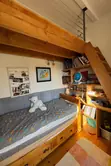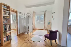 Un joli bureau, qui se ferme avec des portes vitrées, se trouve côté séjour – parfait pour le télétravail ou une bibliothèque. Dans l'espace nuit, vous trouverez 2 chambres et une salle de bain.