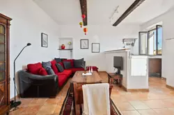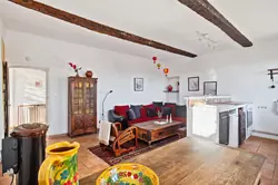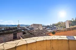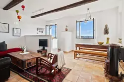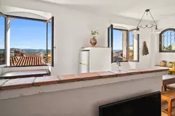 Enfin en haut de l'escalier au 2ème étage se trouve sur la gauche la pièce de vie de bonne dimension, très lumineuse, proposant une superbe vue dégagée sur les toits et les collines au loin. La cuisine toute équipée se trouve dans cette pièce, ainsi que la partie salle à manger et un petit salon canapé / TV.