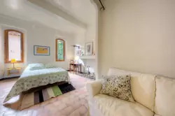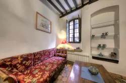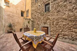 De la rue, vous entrez dans un grand hall d'entrée. De là, il y a l'entrée de l'appartement indépendant composé d'un salon avec plafond voûté, cheminée, kitchenette, salle de bain avec baignoire, WC et double vasque. Une grande chambre a accès à une cour arrière confortable avec beaucoup d'espace pour manger à plusieurs. Il y a aussi des toilettes séparées avec lavabo dans le couloir entre la maison principale et l'appartement.