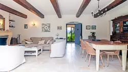Le séjour traversant, avec ses poutres apparentes et sa double exposition, profite d'une belle clarté tout au long de la journée. La cuisine indépendante offre un espace fonctionnel directement connecté aux extérieurs.
