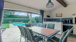 Le jardin entièrement clos et paysagé abrite une piscine chauffée et une annexe avec cuisine d'été, douche et WC, idéale pour profiter des journées ensoleillées.